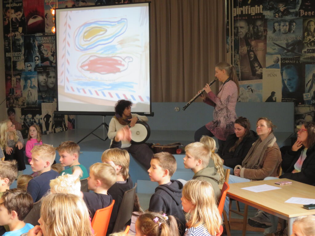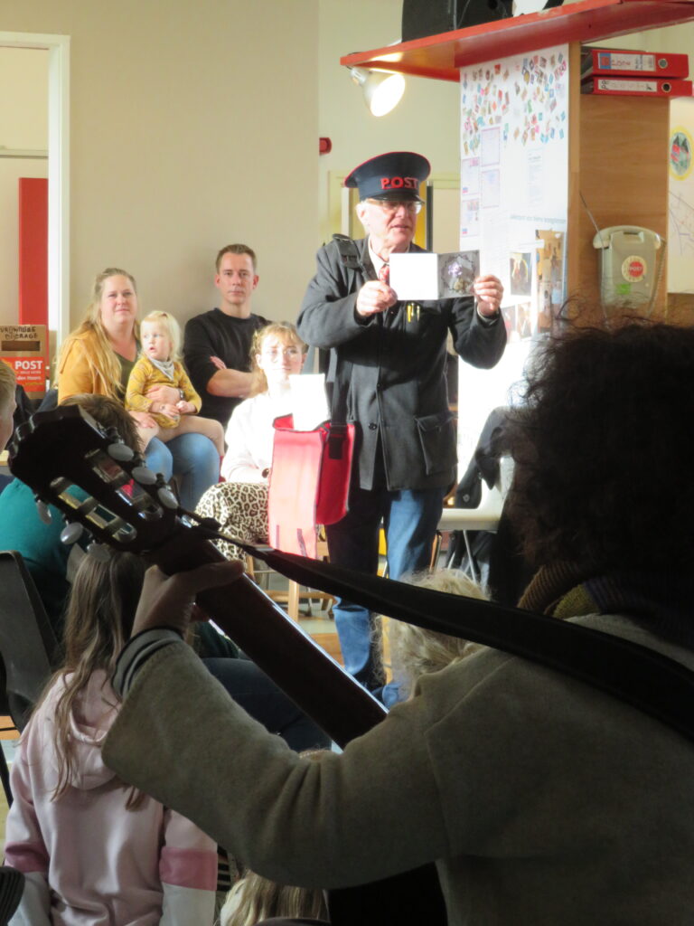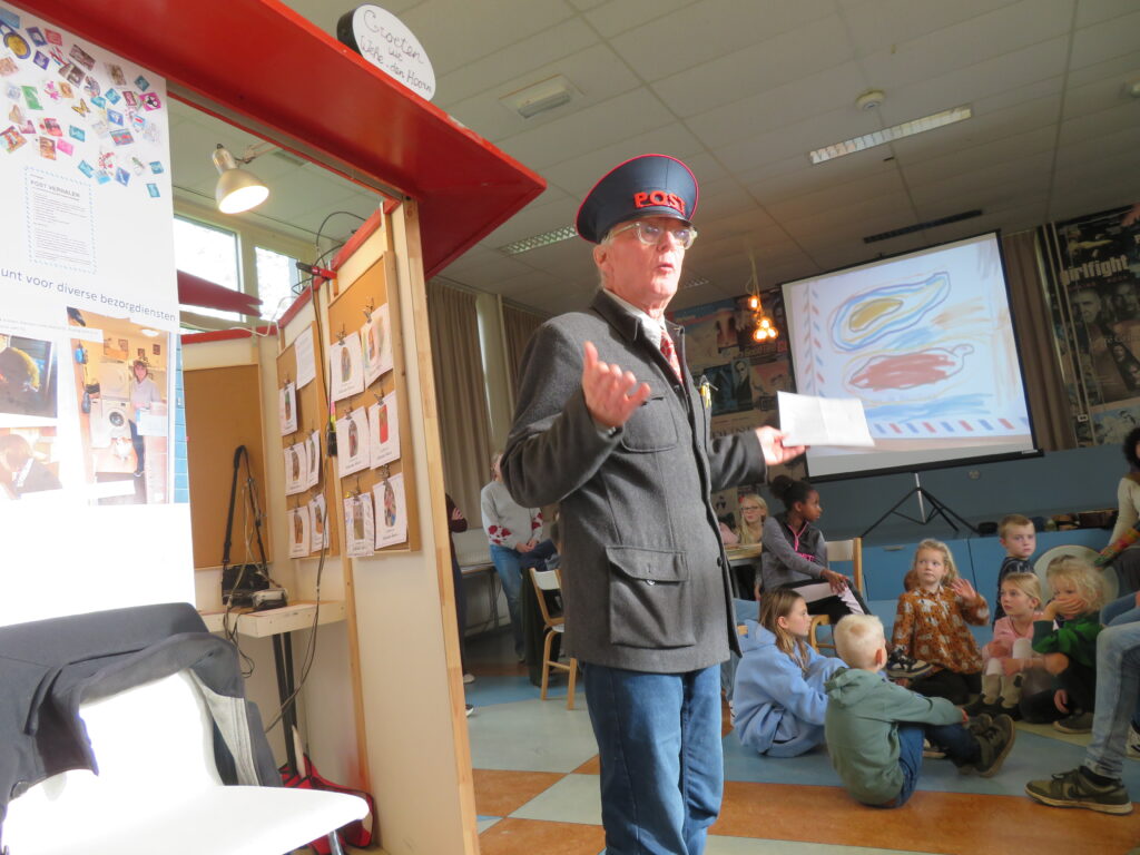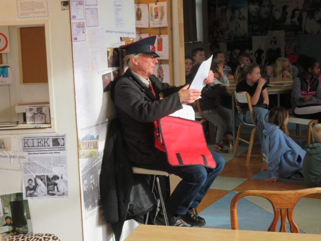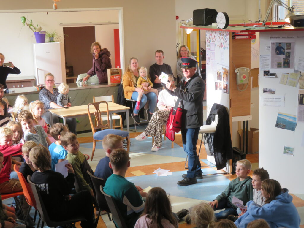 De Postbode liet een aantal foto’s en tekeningen zien op het grote scherm en las enkele teksten voor. De reacties op de teruggestuurde groeten zorgden voor ontroerende momenten, want wie krijgt er tegenwoordig nog een handgeschreven kaart? De kinderen waren zichtbaar verrast door de groetjes die ze ontvingen.