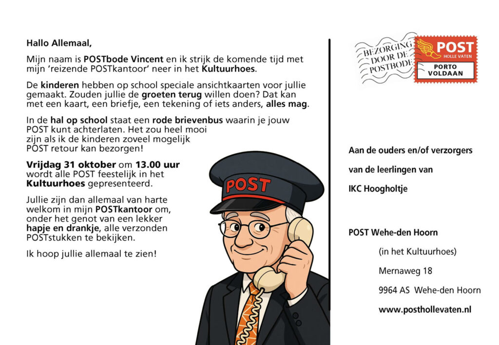 De kinderen hadden hun eigen ansichtkaarten “Groeten uit Wehe-den Hoorn” gemaakt, met daarop hun favoriete plek in het dorp. Deze kaarten stuurden ze vervolgens naar ouders, vrienden of grootouders. En het mooiste? Veel ontvangers stuurden een persoonlijke groet terug!
